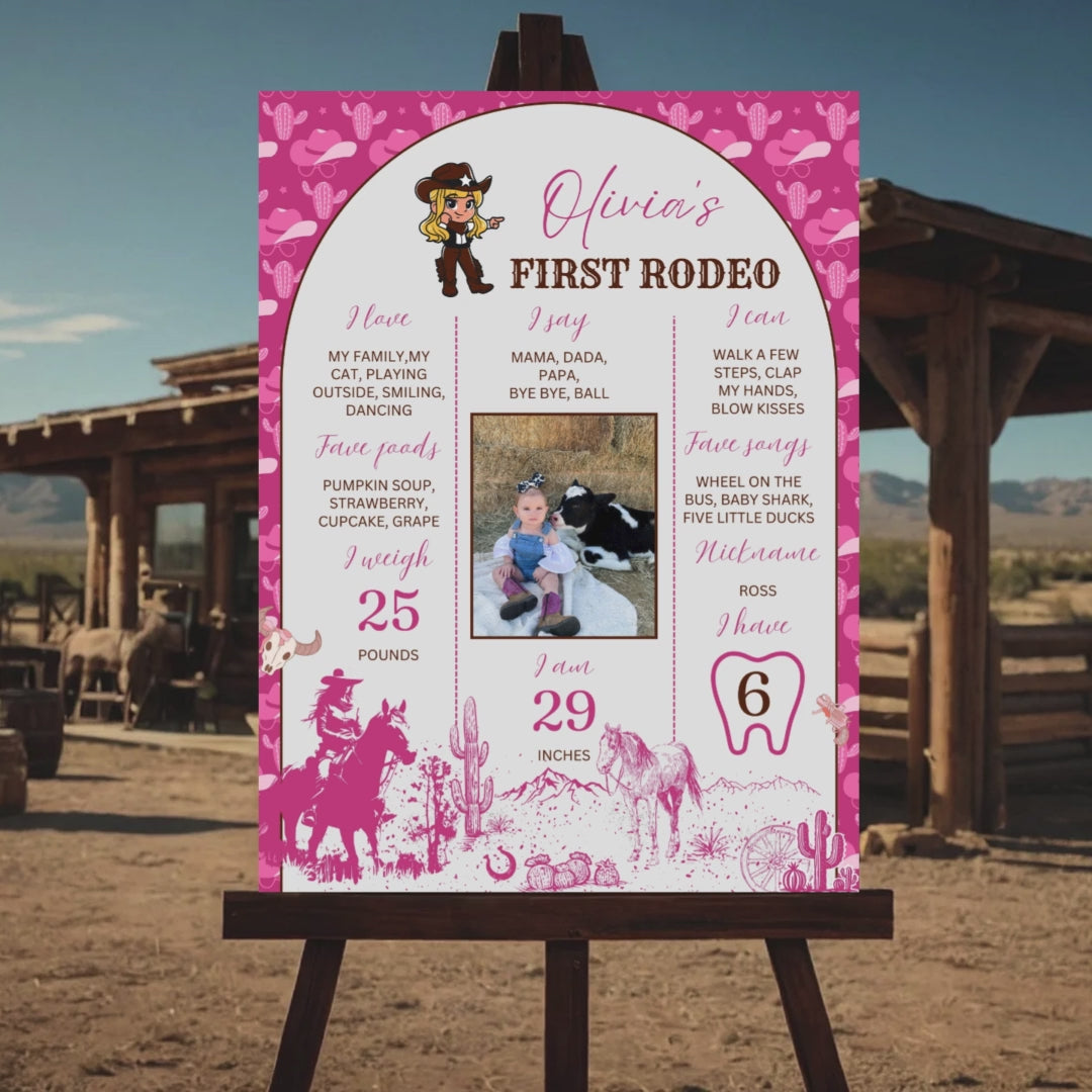 ๐ด Editable Rodeo First Birthday Poster โ Pink Cowgirl Theme ๐ Celebrate your baby girlโs first milestone with this sweet pink western-style welcome sign โ perfect for rodeo or cowgirl-themed parties!
