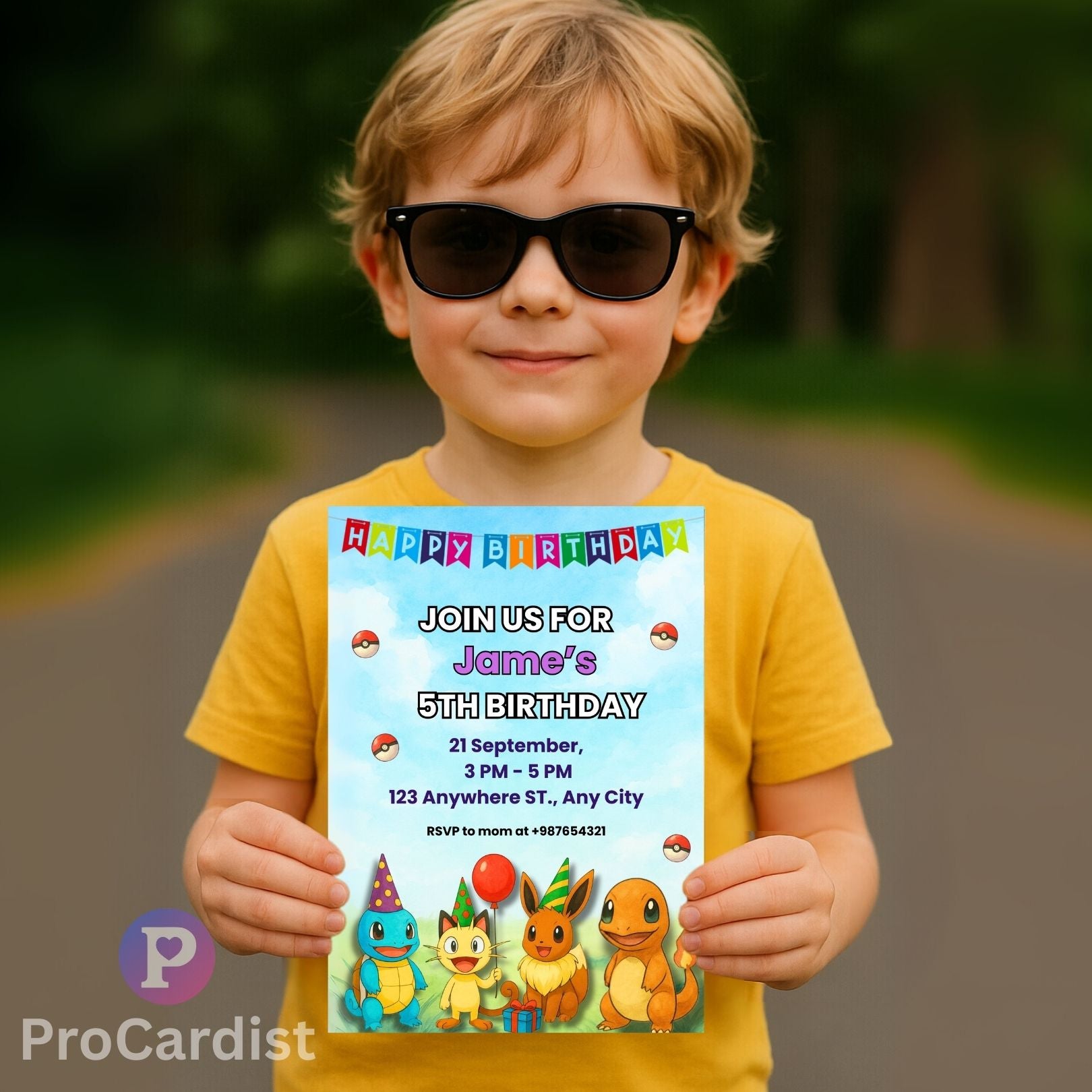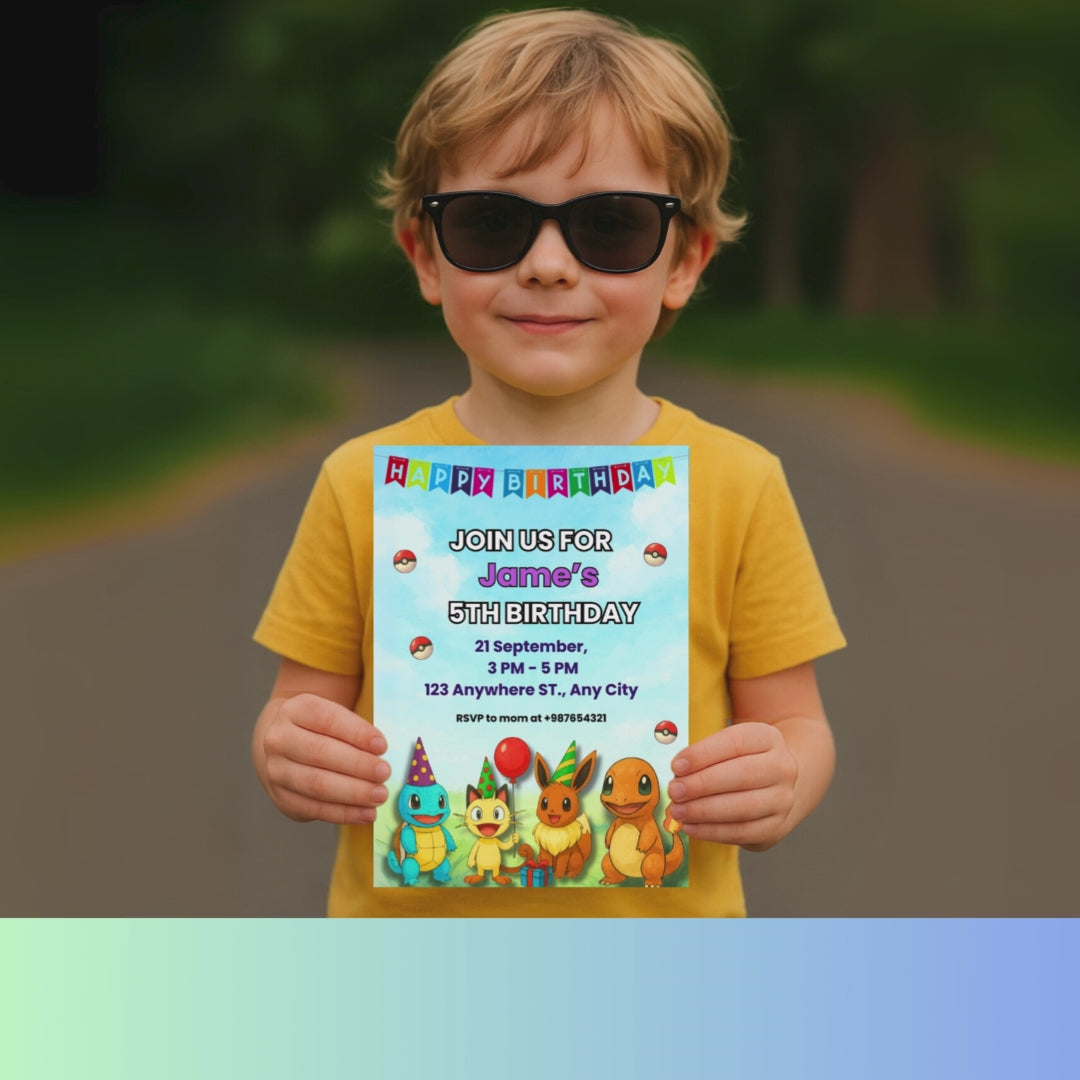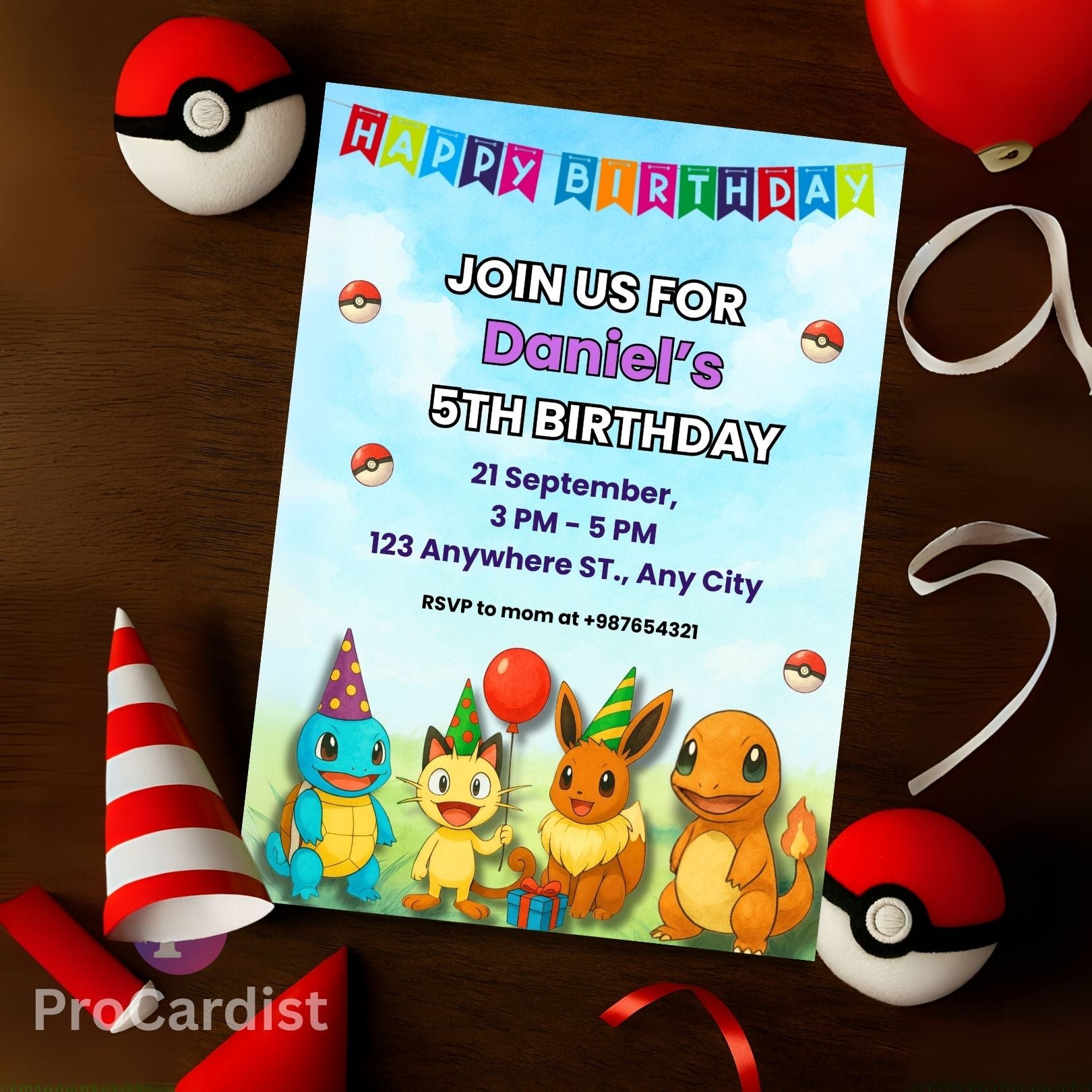 Make your little trainer’s birthday unforgettable with this Pokémon-themed birthday invitation featuring fan-favorite characters like Squirtle, Meowth, Eevee, and Charmander in a festive party design! Perfect for kids who love Pokémon, this invitation brings fun, color, and adventure to their special day.
