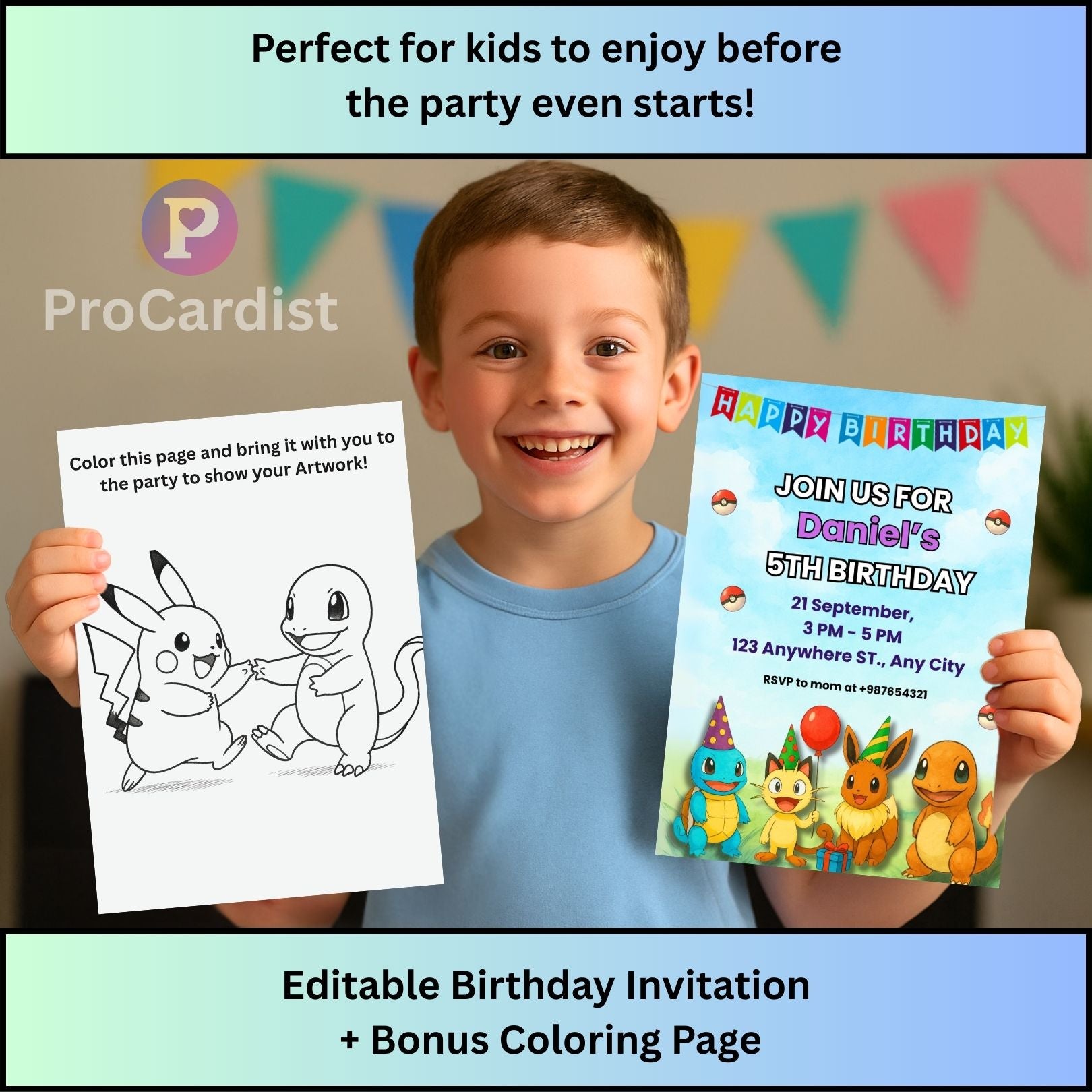 🎉 Pokemon Birthday Invitation + Bonus Coloring Page – Fully Editable Canva Template 🎉