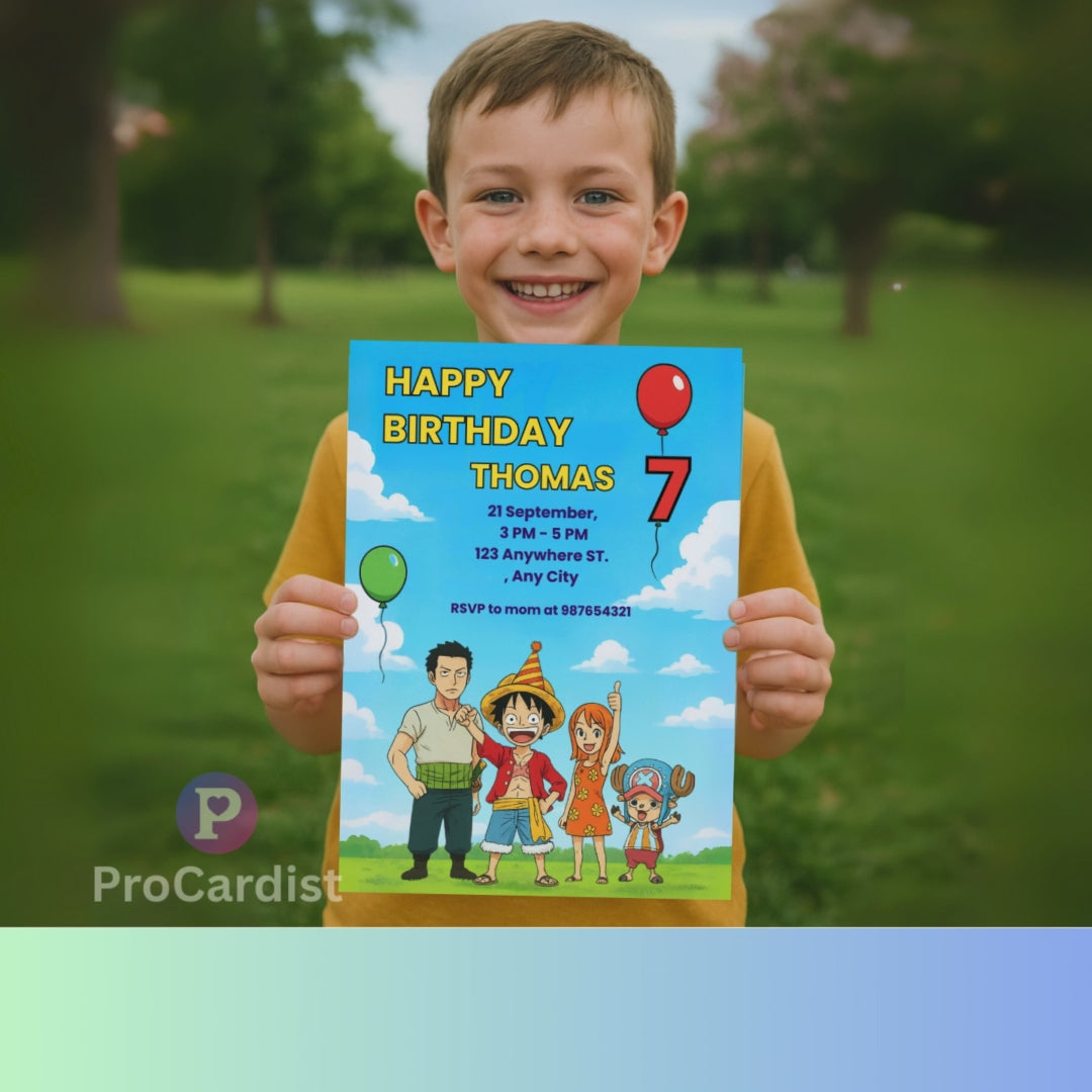 Ahoy Party Planners! Bring the excitement of the Grand Line to your child’s birthday with this One Piece anime-inspired invitation. Featuring Luffy and his crew, this fun design is perfect for young fans ready to set sail on an unforgettable celebration.